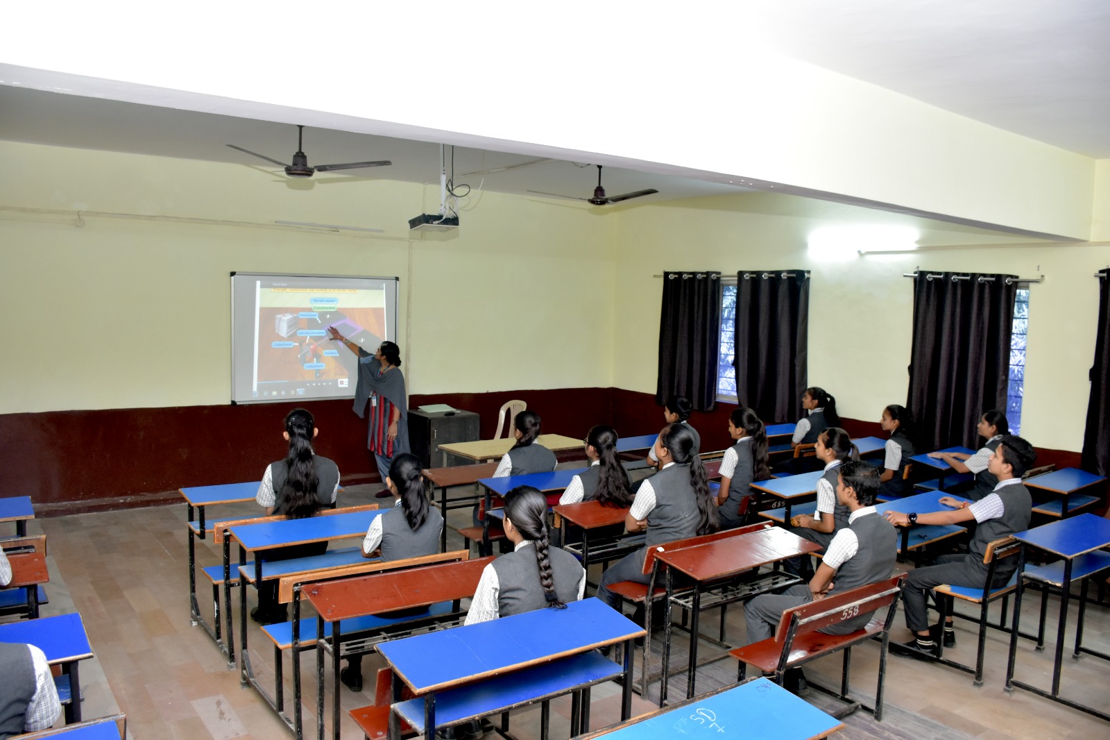 Maorthia English Medium School is equipped with modern smart classrooms that blend traditional teaching with advanced digital tools. The image showcases an interactive teaching session where students are engaged in a lesson using a projector and digital content. These classrooms are designed to make learning more effective, visual, and engaging. Comfortable seating, adequate lighting, proper ventilation, and the use of audio-visual aids create an ideal environment for conceptual clarity and academic excellence. The presence of a focused and disciplined classroom atmosphere reflects the school's commitment to delivering quality education through innovative teaching methods.