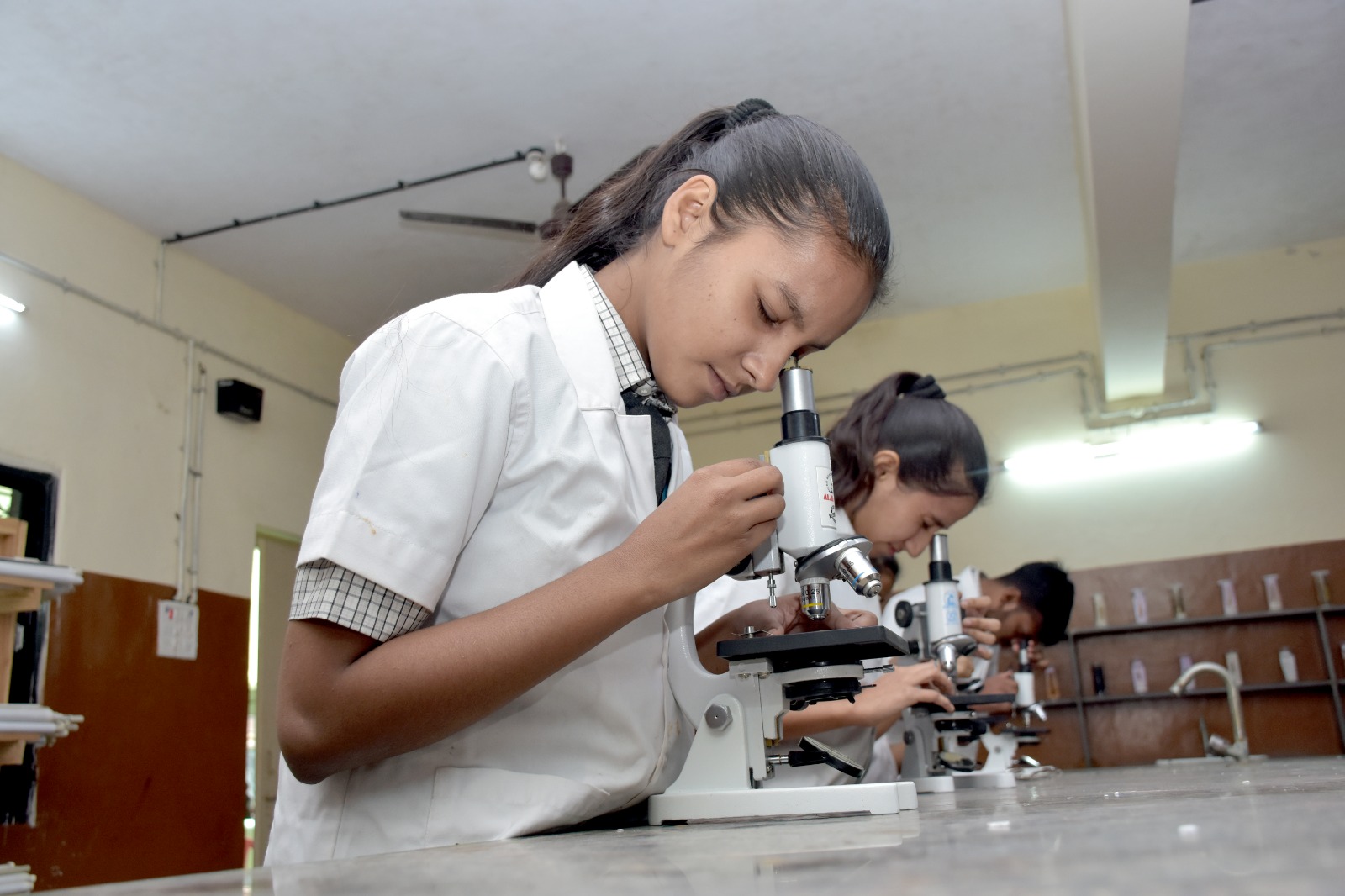 The Biology Lab at Maorthia English Medium School provides students with hands-on learning experiences that deepen their understanding of life sciences. As shown in the image, students are actively engaged in microscopic observation, wearing lab coats and using high-quality compound microscopes. The lab is spacious, well-ventilated, and equipped with all essential instruments and specimens required for detailed biological study. Under the guidance of experienced faculty, students explore the wonders of the microscopic world, develop scientific curiosity, and enhance their practical skills. The lab fosters a scientific mindset, enabling learners to connect theoretical knowledge with real-life biological phenomena.